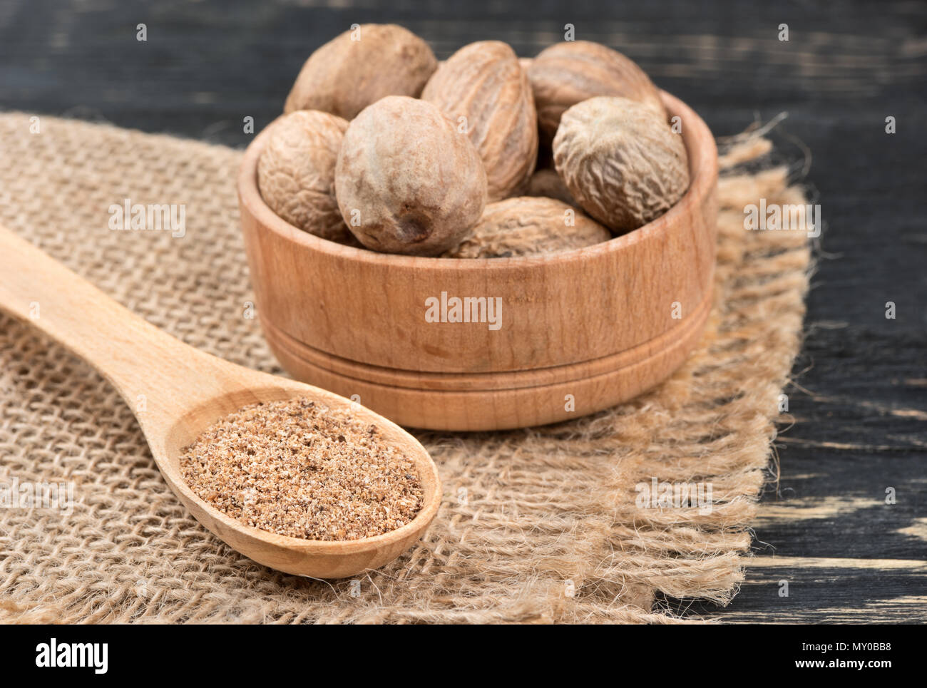 Nutmeg Powder In A Spoon With A Bowl Of Nuts On Burlap Stock Photo Alamy